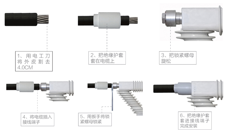 其接线方式为:用电工刀或剥线钳将电缆绝缘外皮割去所需要的长度(较短),将绝缘护套套在电缆上,将电缆插入接线端子,用扳手将锁紧螺母锁紧,套上绝缘护套。